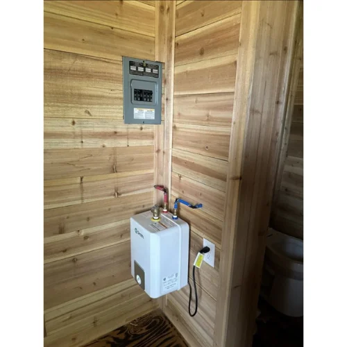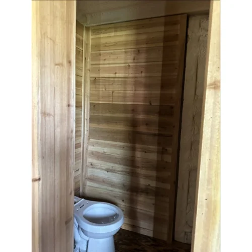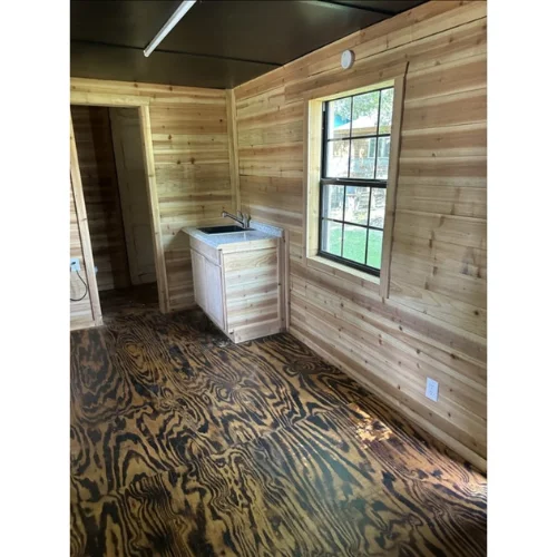 Casa contenedor de 20’x8′ con paredes de cedro y aislamiento de espuma en spray. Incluye armario con lavabo y baño de 4′ (hay que cambiar el inodoro). Debe ser movido por sí mismo.