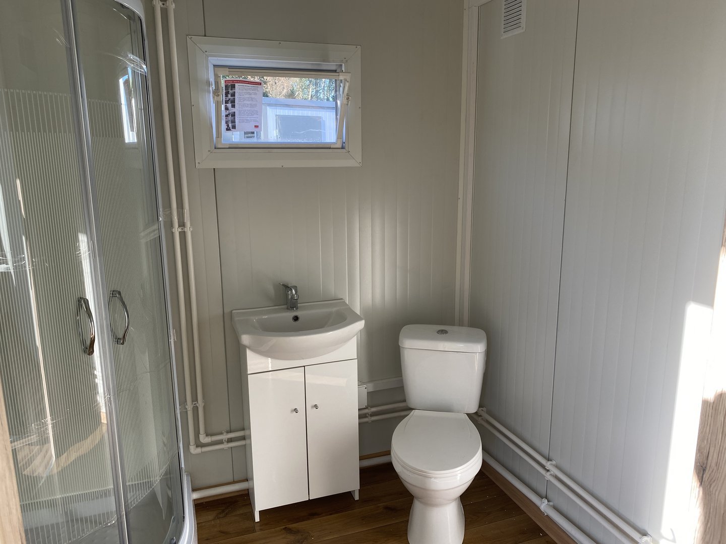 El container dispone de un baño completo con ducha, lavabo con mueble almacenador y urinario. La instalación eléctrica incluye conexión 400V con calentador instantáneo 11 kW, dos termoconvectores eléctricos de pared y plafones LED. El suelo laminado y el PVC en el baño aseguran fácil mantenimiento.