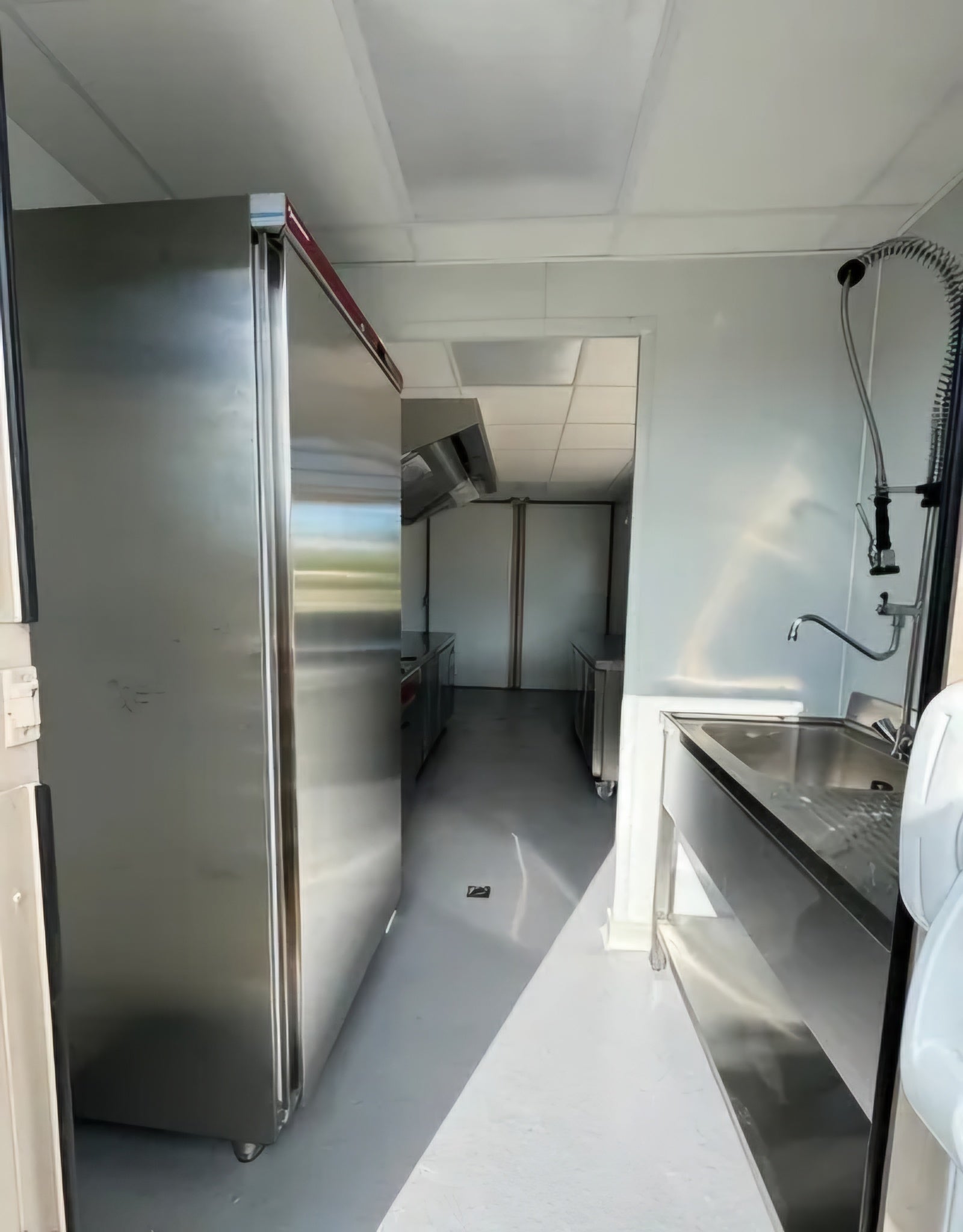 El equipamiento incluye instalación eléctrica con luces LED y tomas de servicio, instalación hidráulica con depósito 1200 litros y calentador instantáneo. Suelo de resina gelcoat gris con desagüe para máxima higiene.
