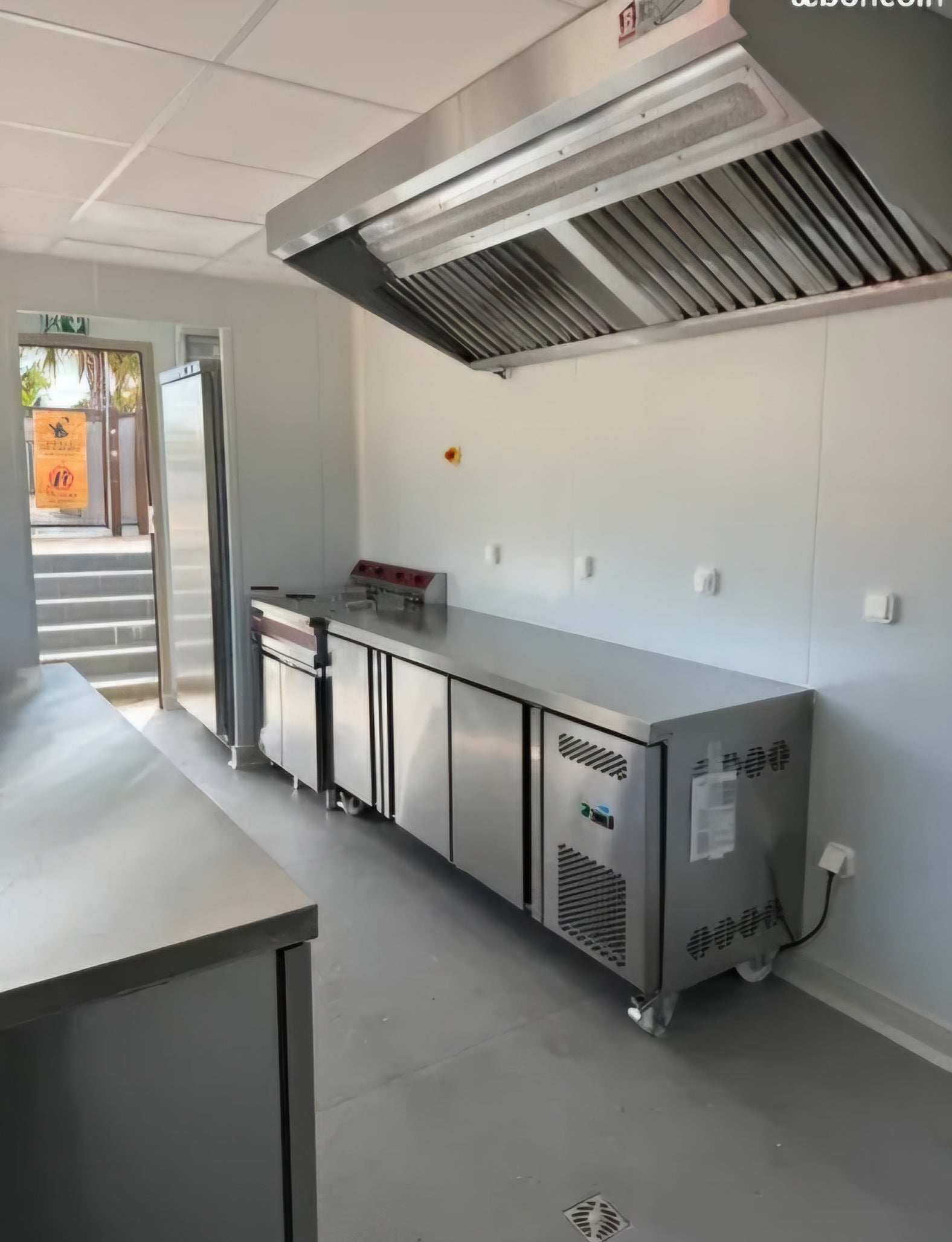 Este contenedor quiosco de 20 pies ofrece una solución completa para su negocio de comida rápida. Equipado con maquinaria profesional incluyendo freidora doble inox, frigorífico negativo y campana extractora. Incluye toldo de gas 3000×1200 mm y mostrador plegable para atención al cliente.